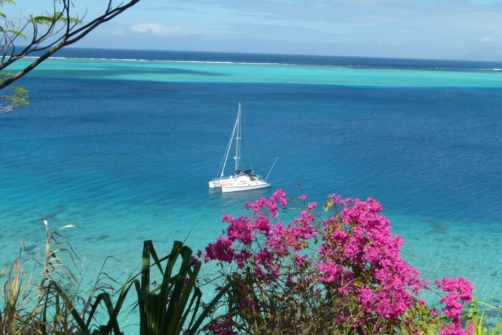 Petite navigation à l'intérieur du lagon de Huahine en direction du Sud. Les camaïeux de bleus sont magnifiques, la végétation à l'intérieur de l'île y est luxuriante.