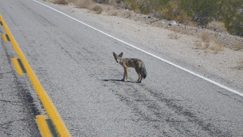 Ensuite nous traversons le Désert de Mojave, ses dunes, ces roches noires, personne (juste un coyote !) sur la route sur 100 kms! très aride.