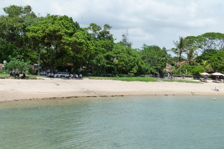 Nous continuons et découvrons la plage de Sanur. Sable blond, hôtels, frangipaniers... Tout y est, mais c'est pas notre truc...