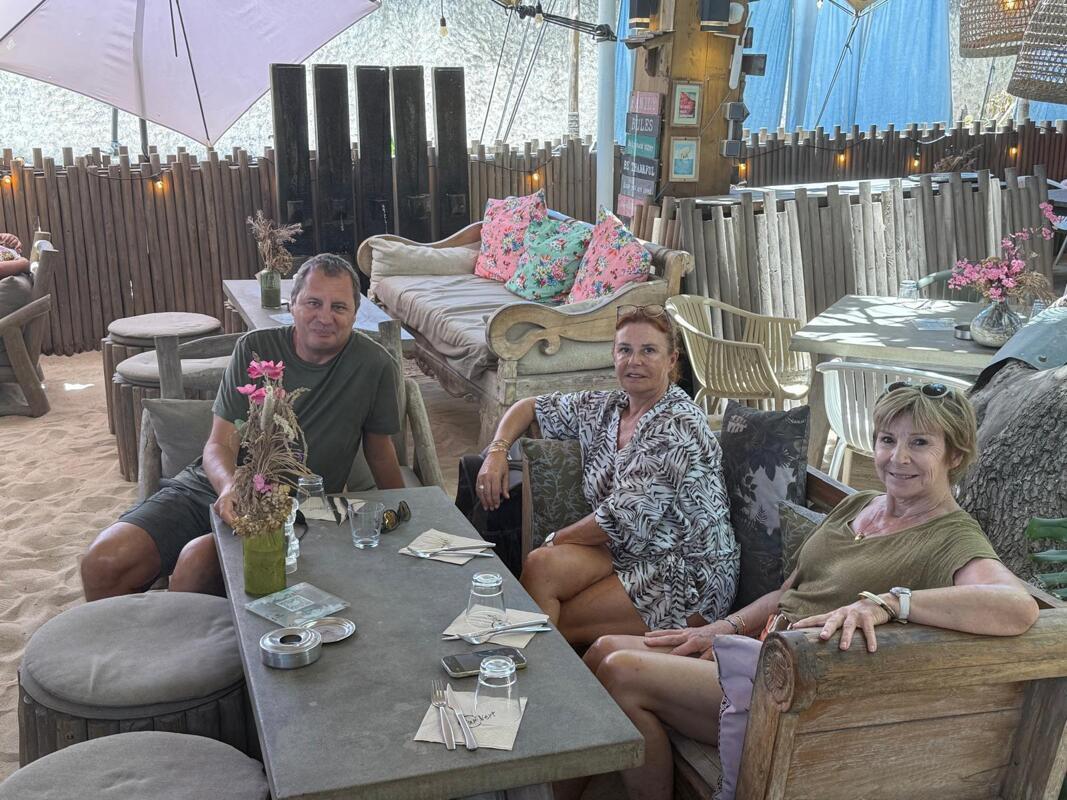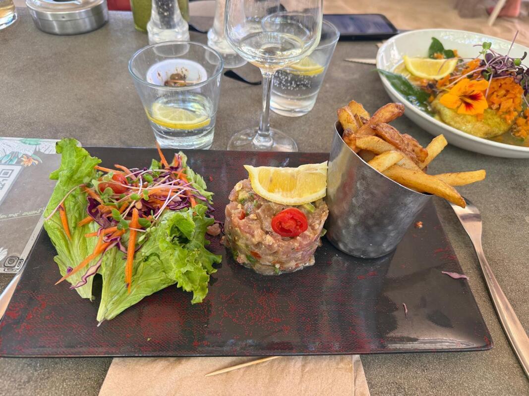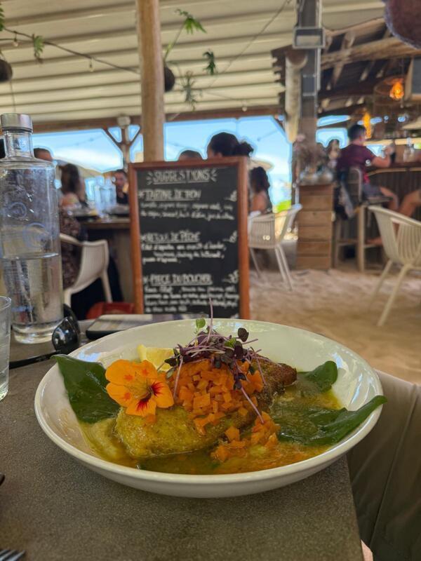 Dejeuner dans un restaurant à Saline les bains, les pieds dans le sable, l'eau du lagon à environ 26°.