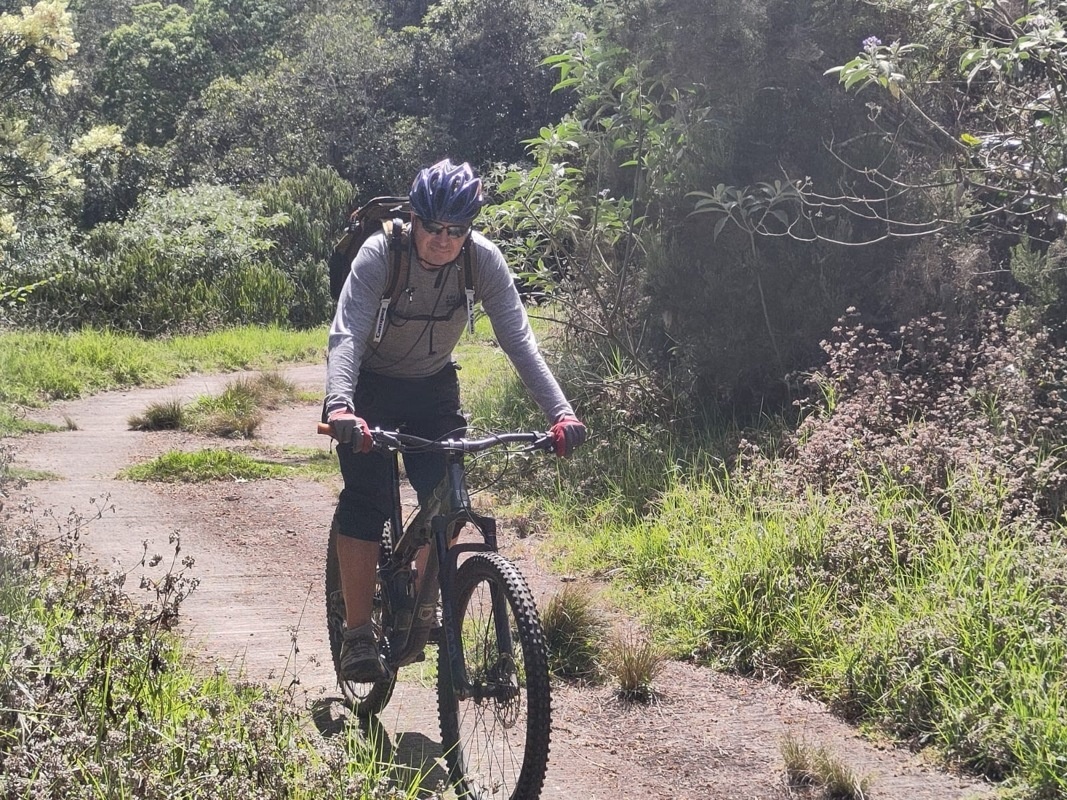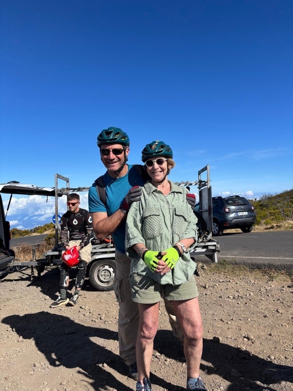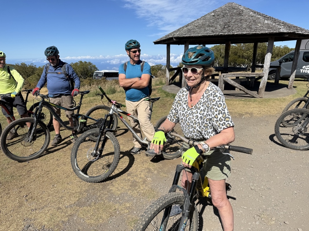 Après les photos prises du belvédère du Maïdo sur Mafate, les consignes de sécurité données par notre guide, nous partons pour 3 heures et plus de 30 kms de descente (seulement quelques montées) avec nos VTT suspendus sur les pentes du piton.