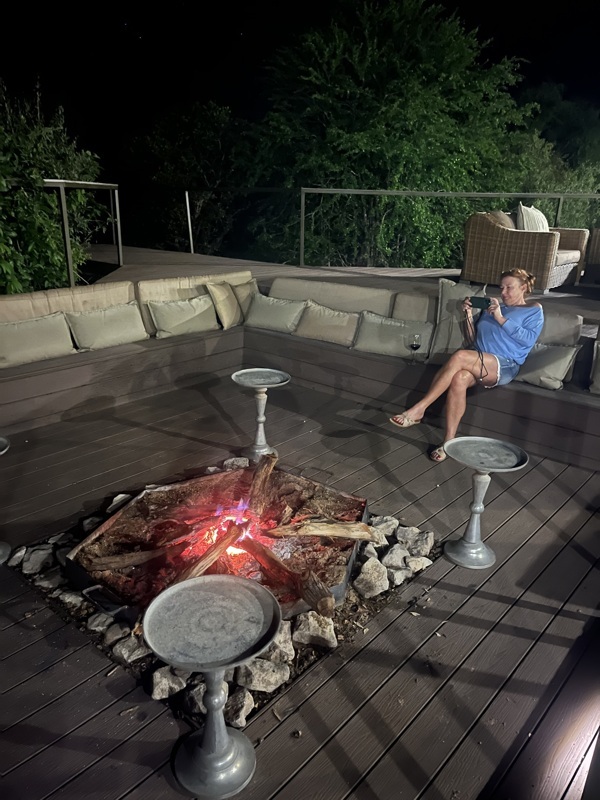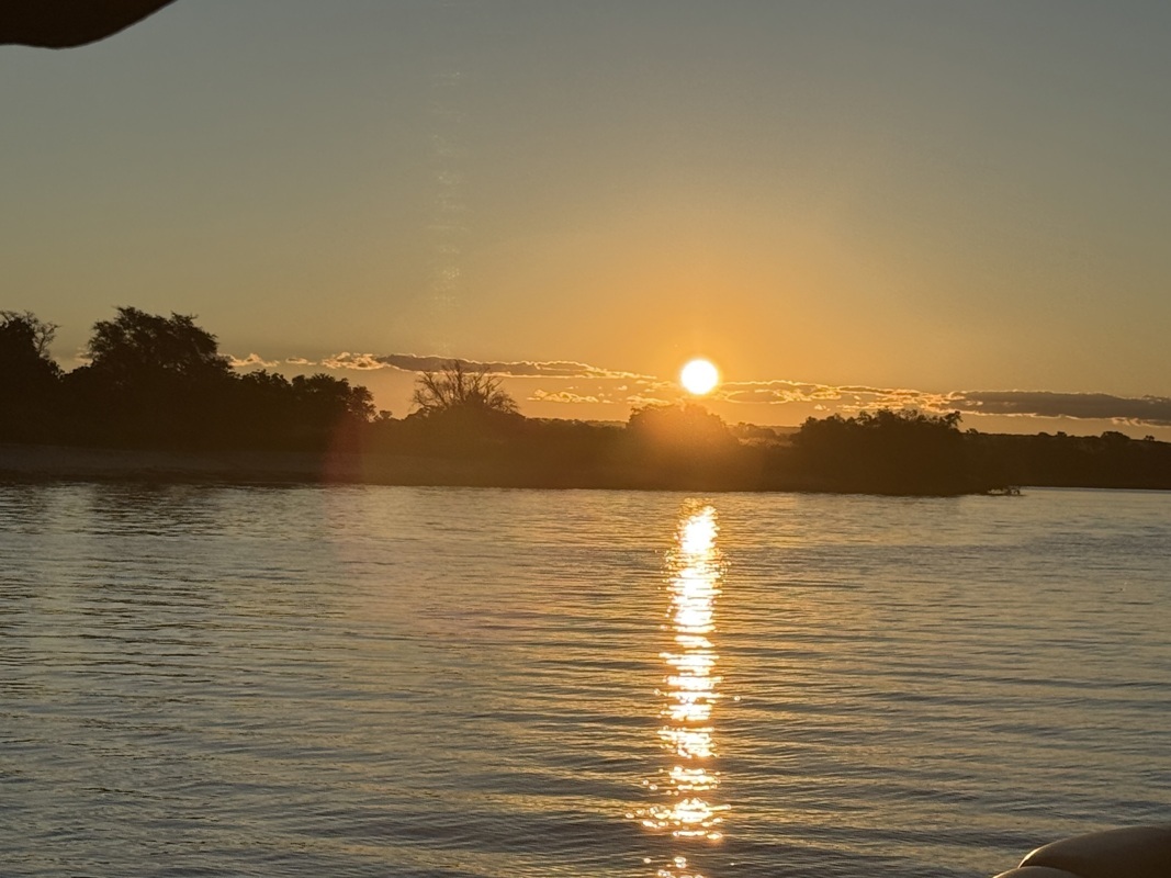Le coucher de soleil face à nous est superbe lorsque nous retraversons le Zambèze en direction de notre lodge.