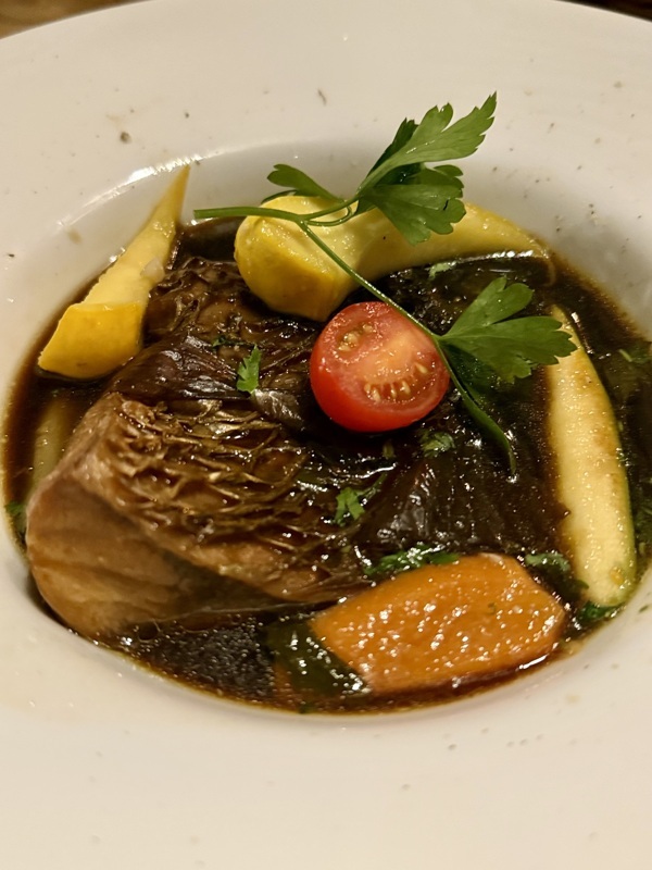 Suivent poulet sauce xxx, carry de poisson, rougail saucisses, aubergines roties, soupe de xxx, gratin de papaye (une tuerie), riz et dessert à la banane. j'ai peut etre oublié quelque chose, mais c'était vraiment excellent.