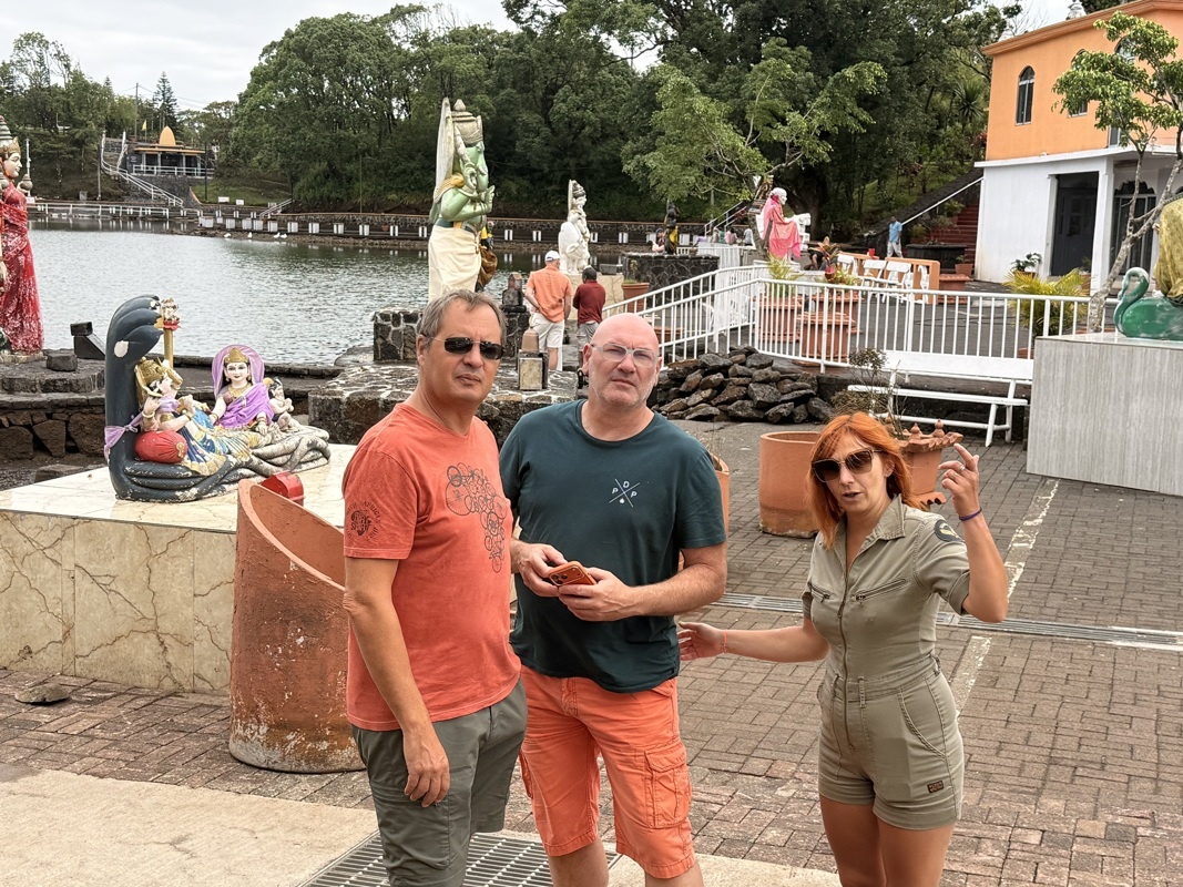 Notre journée commence au temple de Ganga Talao, posé au bord du lac sacré, enveloppé d’encens et de prières. Nous y croisons quelques singes malicieux perchés dans les arbres et avons la chance d’assister à de touchantes offrandes familiales, déposées avec une simplicité désarmante. Un moment suspendu, profondément mauricien.
