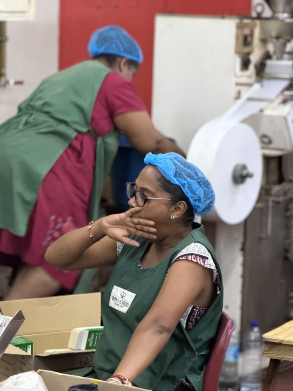 Nous reprenons la route pour rejoindre Bois Chéri, où nous découvrons l’univers du thé. L’usine fonctionne encore à 100 %, dans une ambiance qui rappelle la France des années 50 : machines entièrement mécaniques, équipements simples, normes de protection très éloignées de celles que nous connaissons.