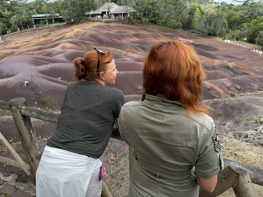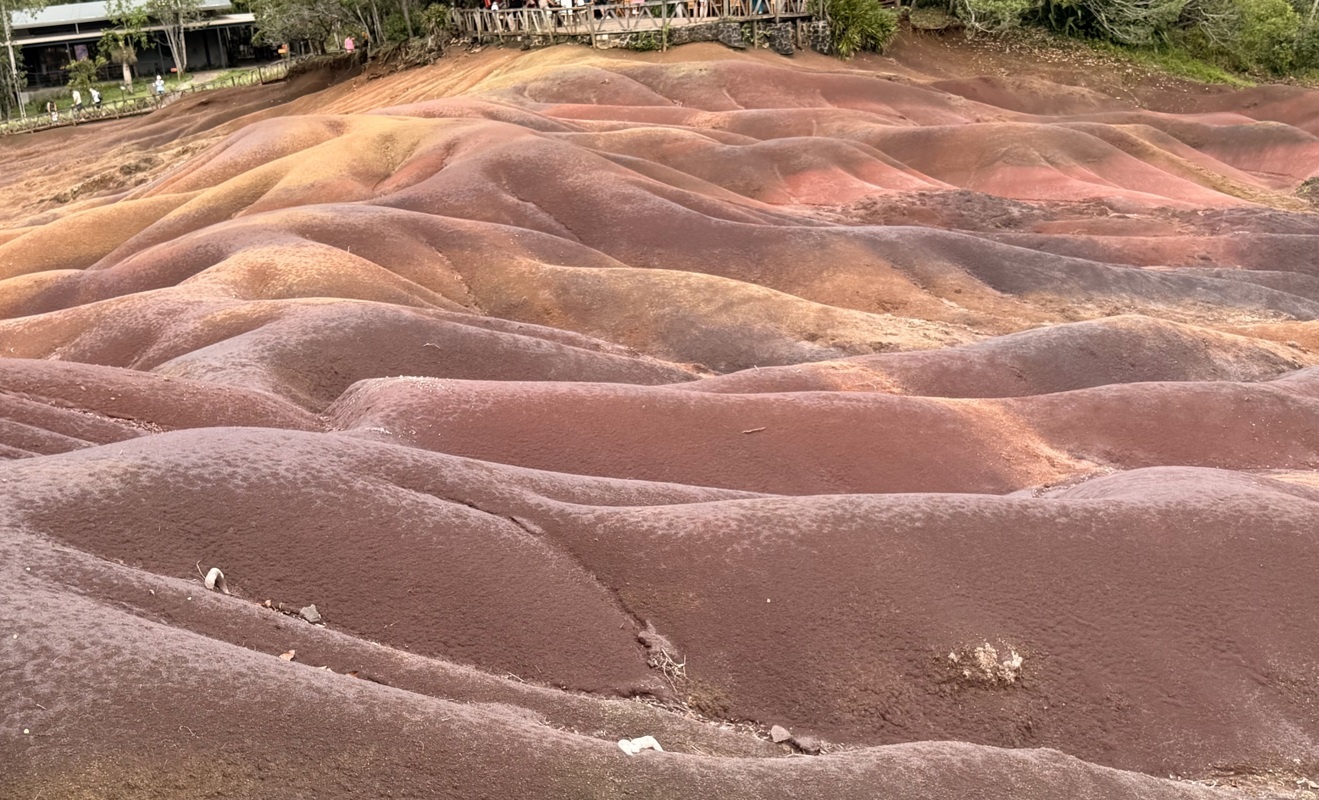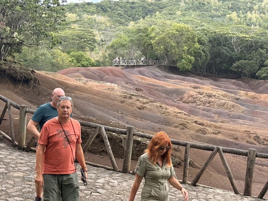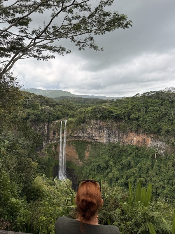Par chance le temps tient toujours — pas une goutte de pluie, un miracle. Nous poursuivons vers les Sept Couleurs de Chamarel et la grande cascade, la plus haute de l’île avec ses 100 mètres. C’est beau, impressionnant même, mais très organisé, très touristique… loin de l’authenticité que nous aimons tant depuis le début du voyage.