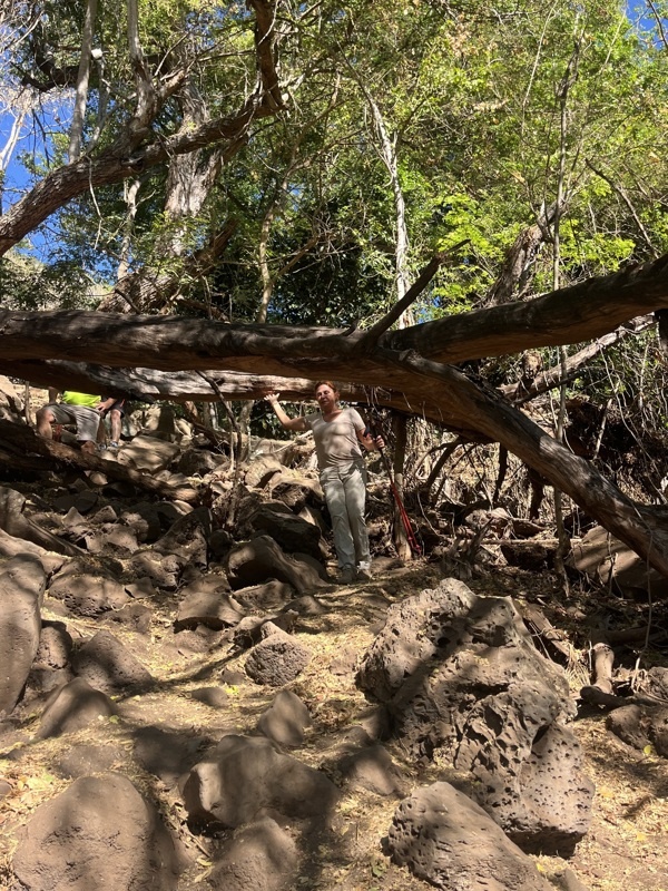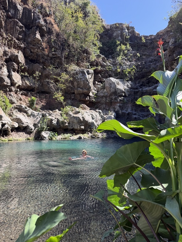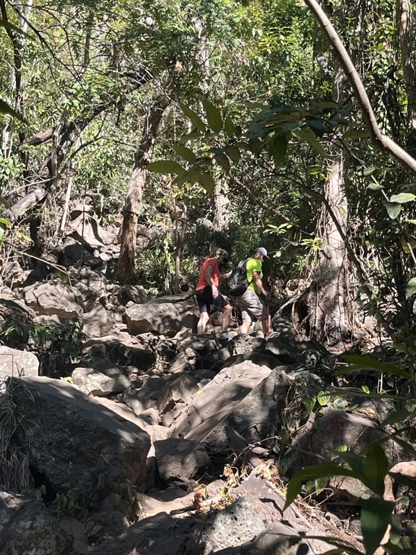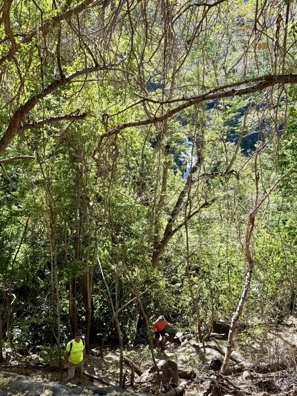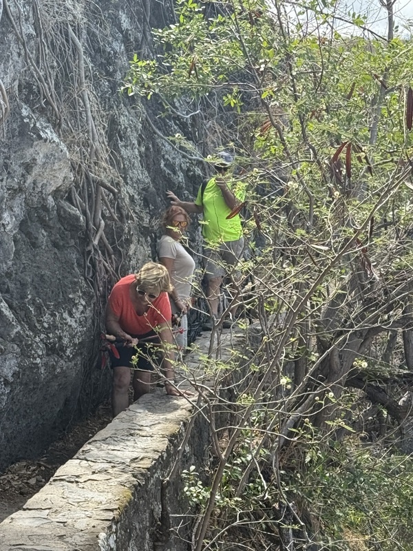 Baignade dans la dernière bassine pour Caro et retour sur un sentier à flanc de falaise, taillé dans la roche avec des passages creusés dans la montagne. Nous n'avions pas encore eu ce genre de décor.