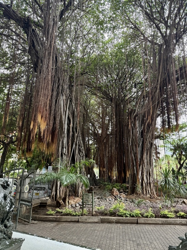 Nous rejoignons ensuite un parc où Christophe, notre guide, nous fait découvrir un arbre absolument fascinant : le banian. Chaque liane qui tombe du tronc s’enracine dans le sol pour devenir un nouvel arbre, créant un réseau végétal impressionnant. Celui que nous observons, haut d’environ trente mètres, n’a pourtant que… trente ans. Une vitesse de croissance stupéfiante. On nous explique aussi que, même s’il représente un refuge pour de nombreuses espèces, il peut attirer les termites, qui finissent par l’envahir.