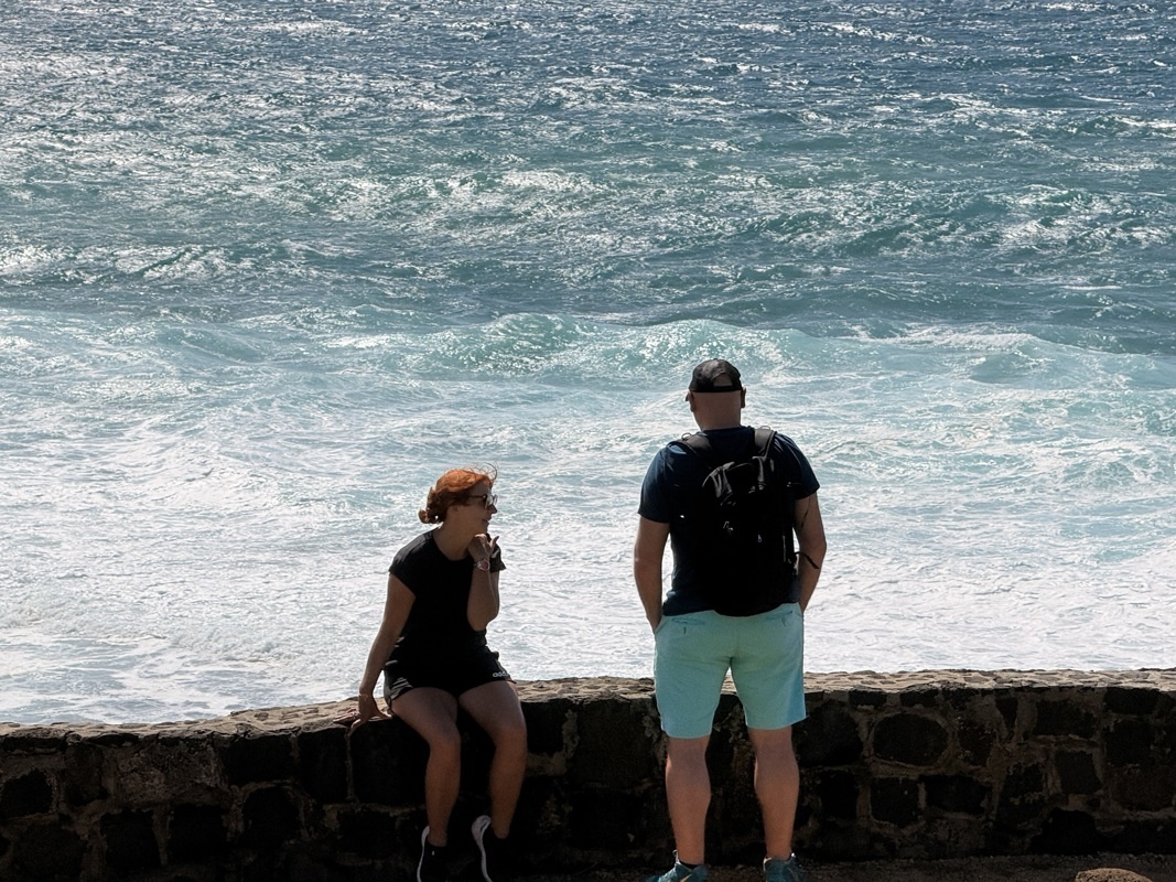 L’accès se mérite. La descente comme la remontée se font de manière franchement périlleuse, à l’aide d’une corde. Depuis le début de la randonnée, nous sommes accompagnés par plusieurs chiens errants. L’île en est remplie, et ils suivent naturellement les marcheurs. Pour notre part, ils sont quatre à nous escorter fidèlement, n’hésitant pas à grimper avec nous les passages raides pour remonter depuis la plage.