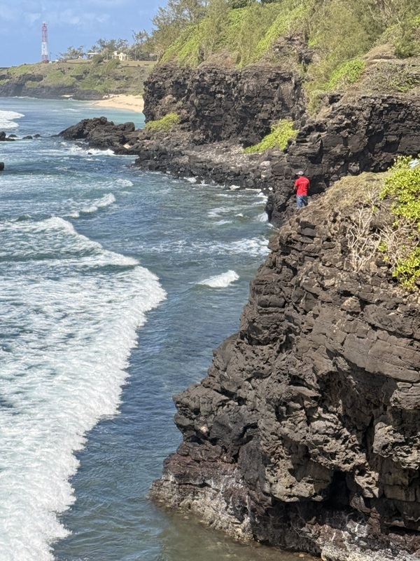 Sur place, un groupe de Mauriciens se baigne déjà dans la cascade, imperturbable. Arveen propose alors une alternative un peu plus loin: une piscine naturelle dans la roche alimentée par les vagues de l’océan.