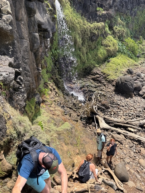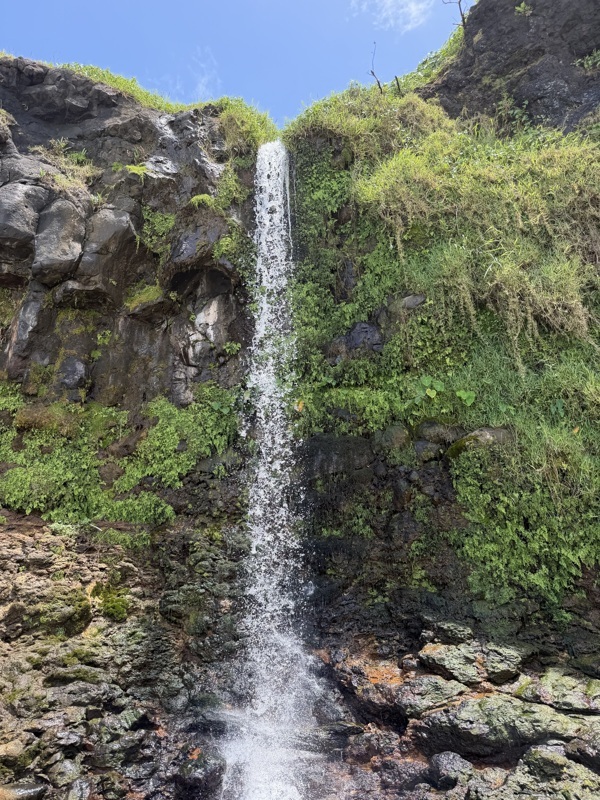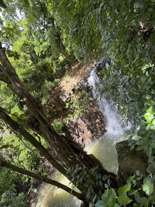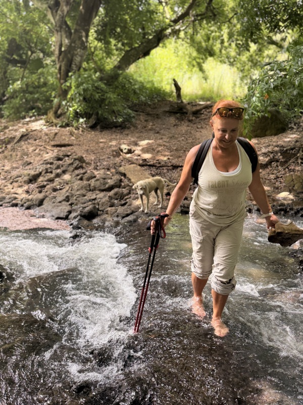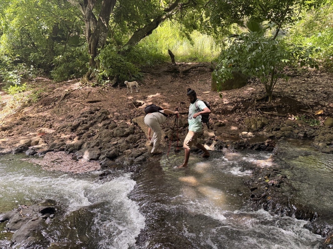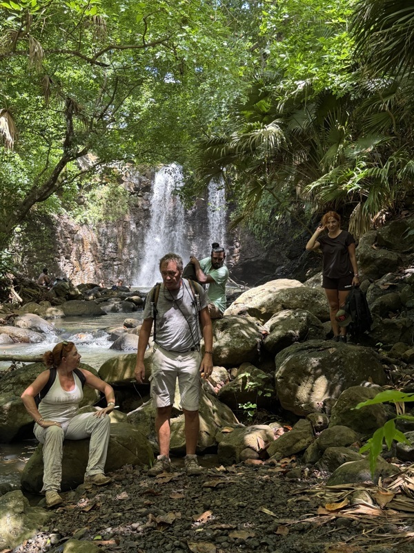 Après avoir observé le célèbre Rocher qui pleure, nous quittons la côte pour nous enfoncer dans les terres, direction la cascade des Demoiselles. Très vite, l’aventure prend une tournure plus sportive que prévue. Traversée de rivière pieds nus, puis descente tout aussi pieds nus vers la cascade, dans une ambiance aussi folklorique que glissante.