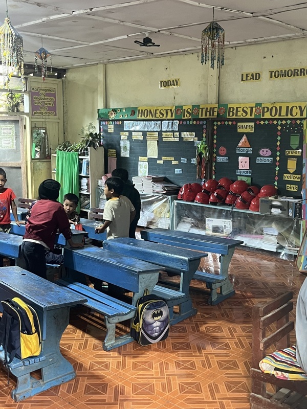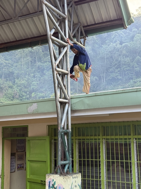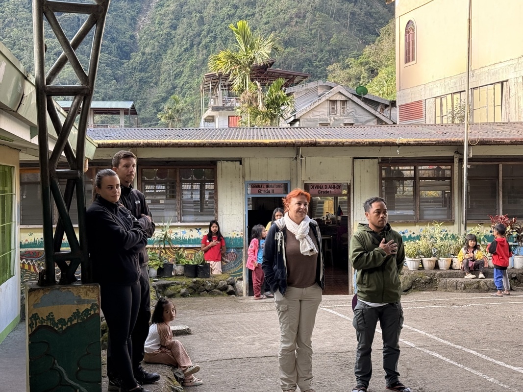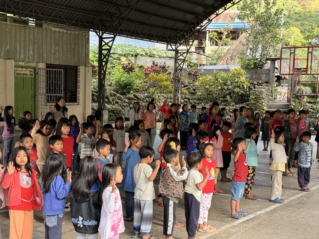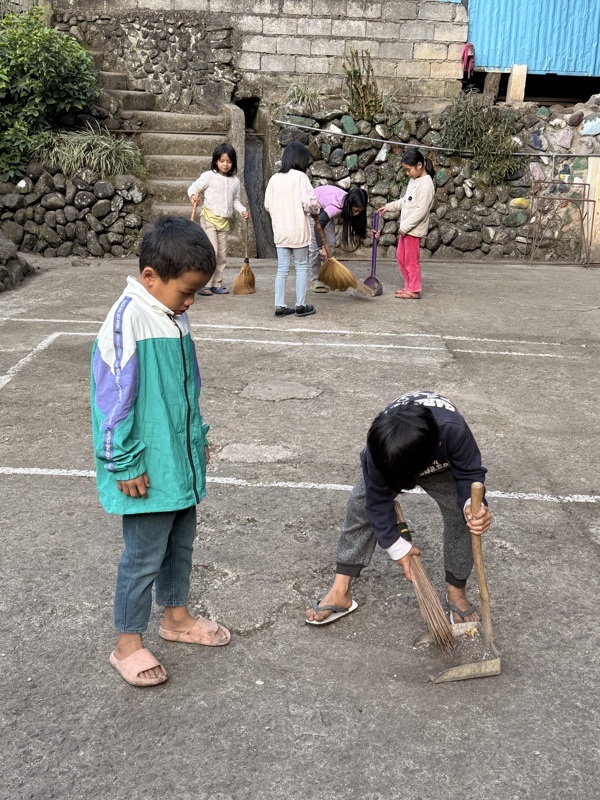 Ce matin à 7h30 nous allons à l’école primaire du village pour assister au rituel journalier. Les enfants de tous âges balaient et nettoient la cour. (Le soir après la journée ils font le ménage de leur classe)